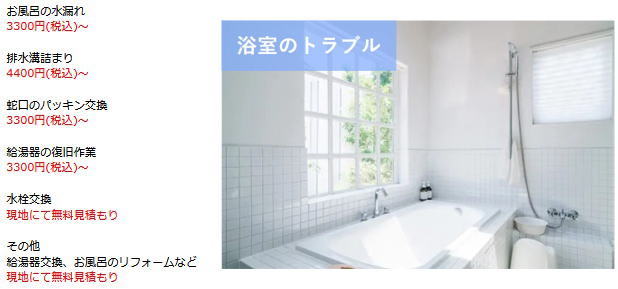 滋賀県で対応可能なお風呂(浴室)の修理サービスとなります。その他のトラブルはお気軽に受付スタッフまでご相談ください。